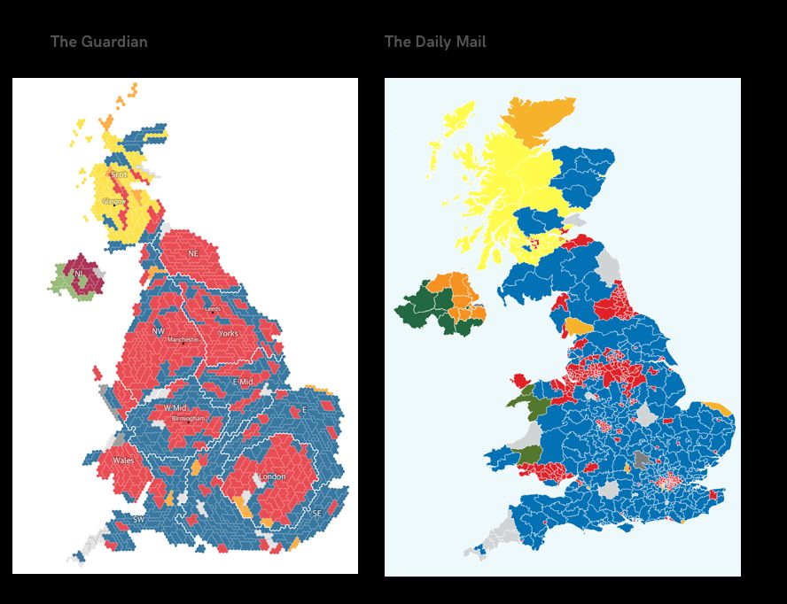 : Two graphics depicting the same voting patterns in the same country